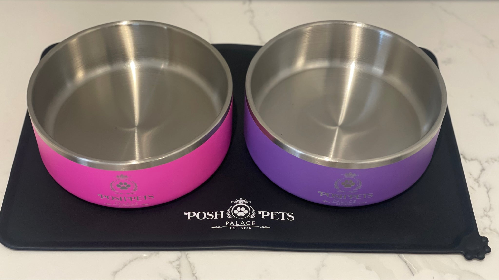 One Size - 48cm x 30cm allowing for two Large (2 Ltr) Pet Food & Water Bowls to fit onto the Pet Food & Water Mat with room to spare on both sides. See also (as shown) our Posh Pets Food & Water Bowls for best results).